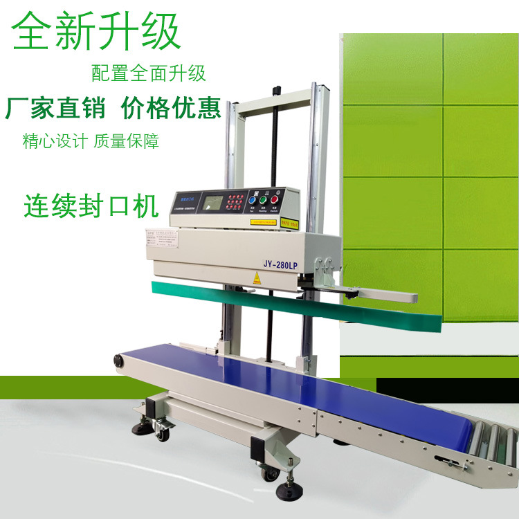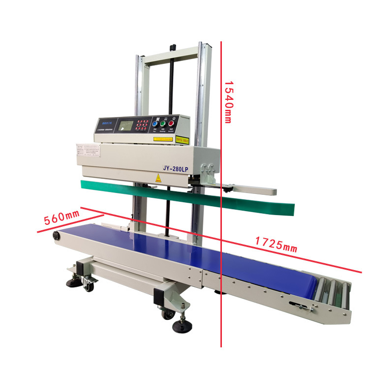 • 可升降功能:大型立式可升降連續式封口機的封口裝置具備可升降特性。這一功能主要通過電動或液壓系統來實現,能夠根據包裝材料的厚度、產品的高度以及封口位置的要求靈活調整封口高度。例如,當包裝較厚的產品或使用較厚的包裝材料時,可以升高封口裝置;反之,對于薄型包裝材料或小型產品,可以降低封口裝置,以確保封口質量和效率。