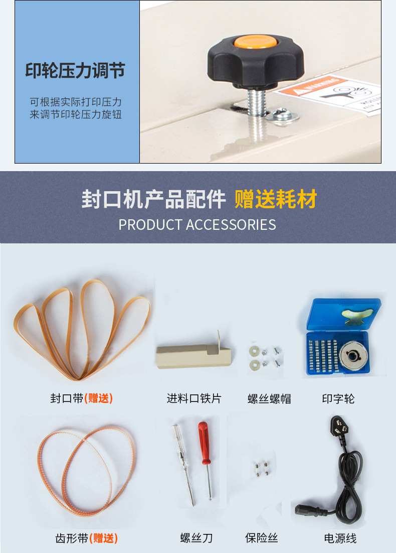 根據常用包裝袋的尺寸,選擇封口寬度和厚度合適的封口機。如封袋寬度較大,需選封口寬度大的機型,一般連續式封口機的封口寬度在 4-14mm 之間可調7.
