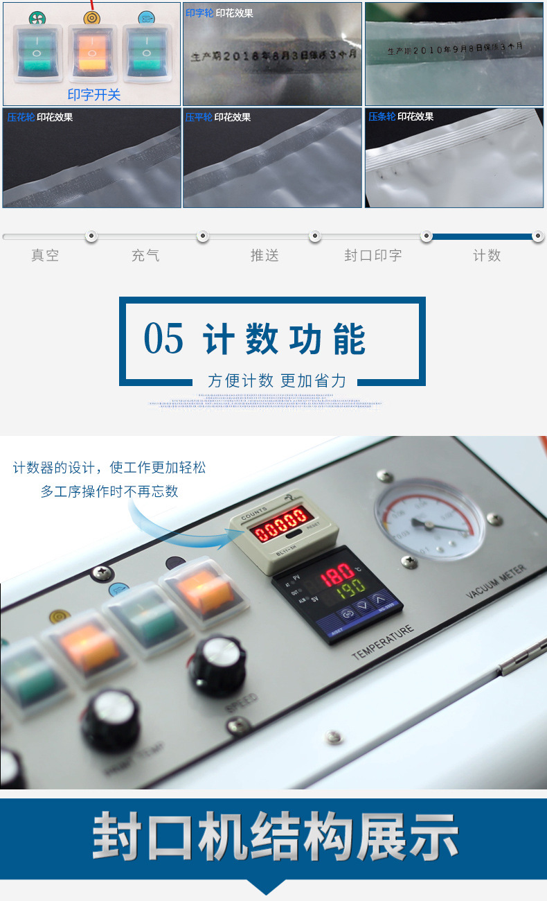 - 包裝質(zhì)量穩(wěn)定:精準(zhǔn)的真空度控制與熱封技術(shù),確保每個(gè)產(chǎn)品的包裝都能達(dá)到均勻的真空效果,封口嚴(yán)密、規(guī)整,有效防止產(chǎn)品氧化、受潮、變質(zhì),有力保障產(chǎn)品品質(zhì)。