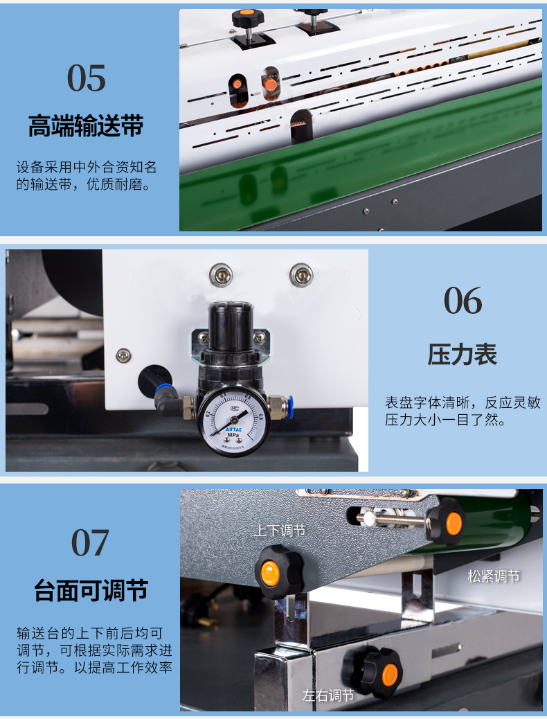 連續(xù)式抽真空包裝機(jī)整個(gè)流程一氣呵成,借助輸送帶的勻速、持續(xù)運(yùn)轉(zhuǎn),實(shí)現(xiàn)產(chǎn)品不間斷地包裝