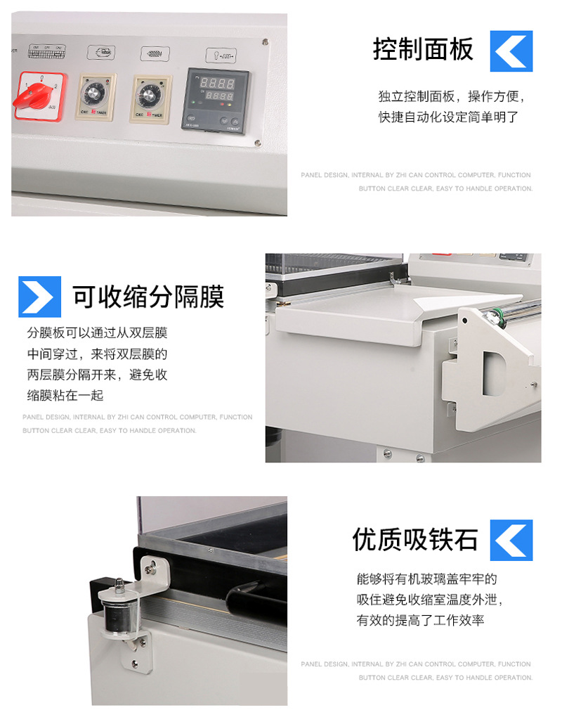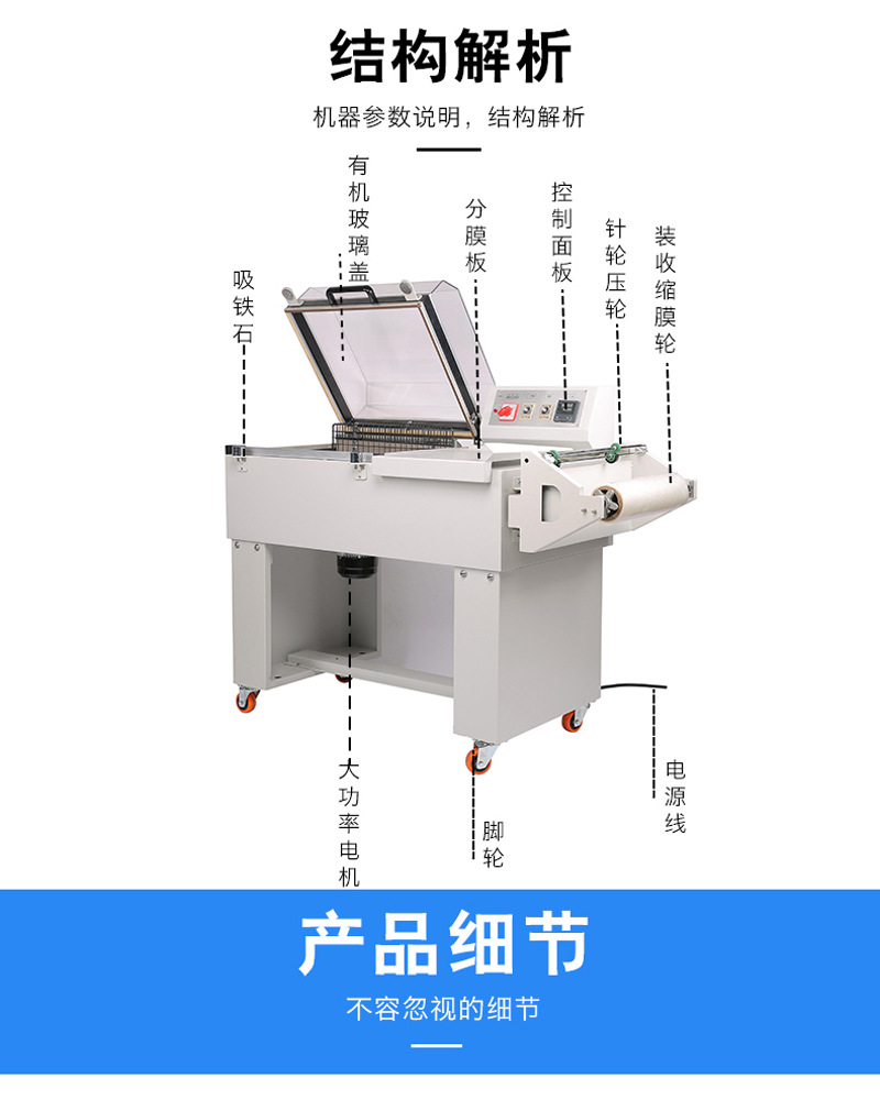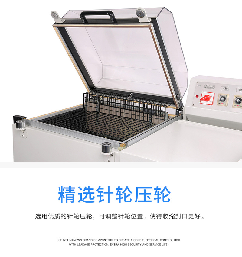 - 二合一的設計使得包裝過程更加緊湊和高效。一次操作即可完成封切和熱收縮兩個步驟,大大提高了生產效率。與傳統的分別進行封切和熱收縮的設備相比,節省了時間和人力成本。