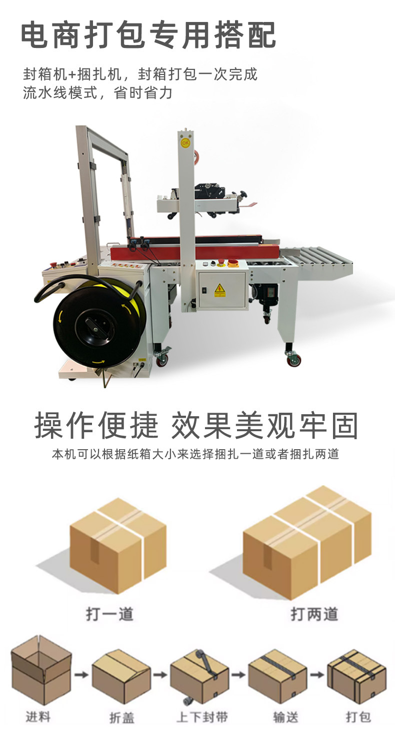 全自動封箱打包機適用范圍廣:可以對各種形狀、大小的物品進行包裝,只要選擇合適的紙箱和包裝材料(如膠帶、打包帶等),就能滿足不同產品的包裝需求。