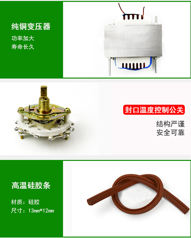 - 如前面所說,加熱條是由高電阻的合金材料制成的,常見的有鎳鉻合金等。它的長度和寬度會根據不同型號的腳踏封口機而有所不同,一般是要能夠覆蓋住常見包裝袋的封口寬度范圍。加熱條的兩端通過導線與封口機的電路相連接,當電路接通時,它就能快速升溫產生熱量啦。而且為了保證加熱的均勻性,加熱條在制作工藝上也會有一些講究,比如采用均勻繞制等方式。