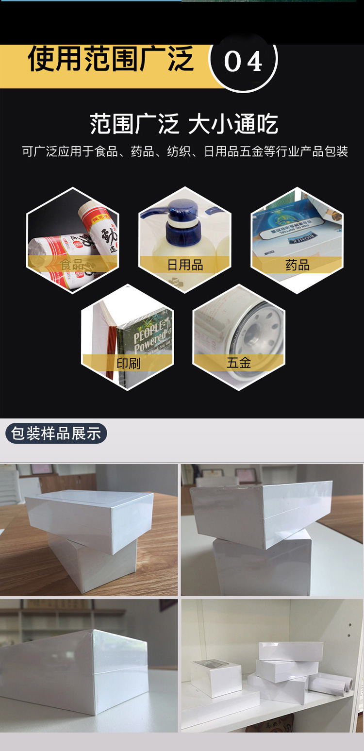 • 可以適應多種包裝薄膜材質,如 POF、PVC、PP 等熱收縮薄膜,并且能夠對不同形狀、大小和重量的產品進行包裝。無論是小型的電子配件、食品,還是大型的玩具、五金工具等,都可以使用全自動封切機進行高效包裝。
