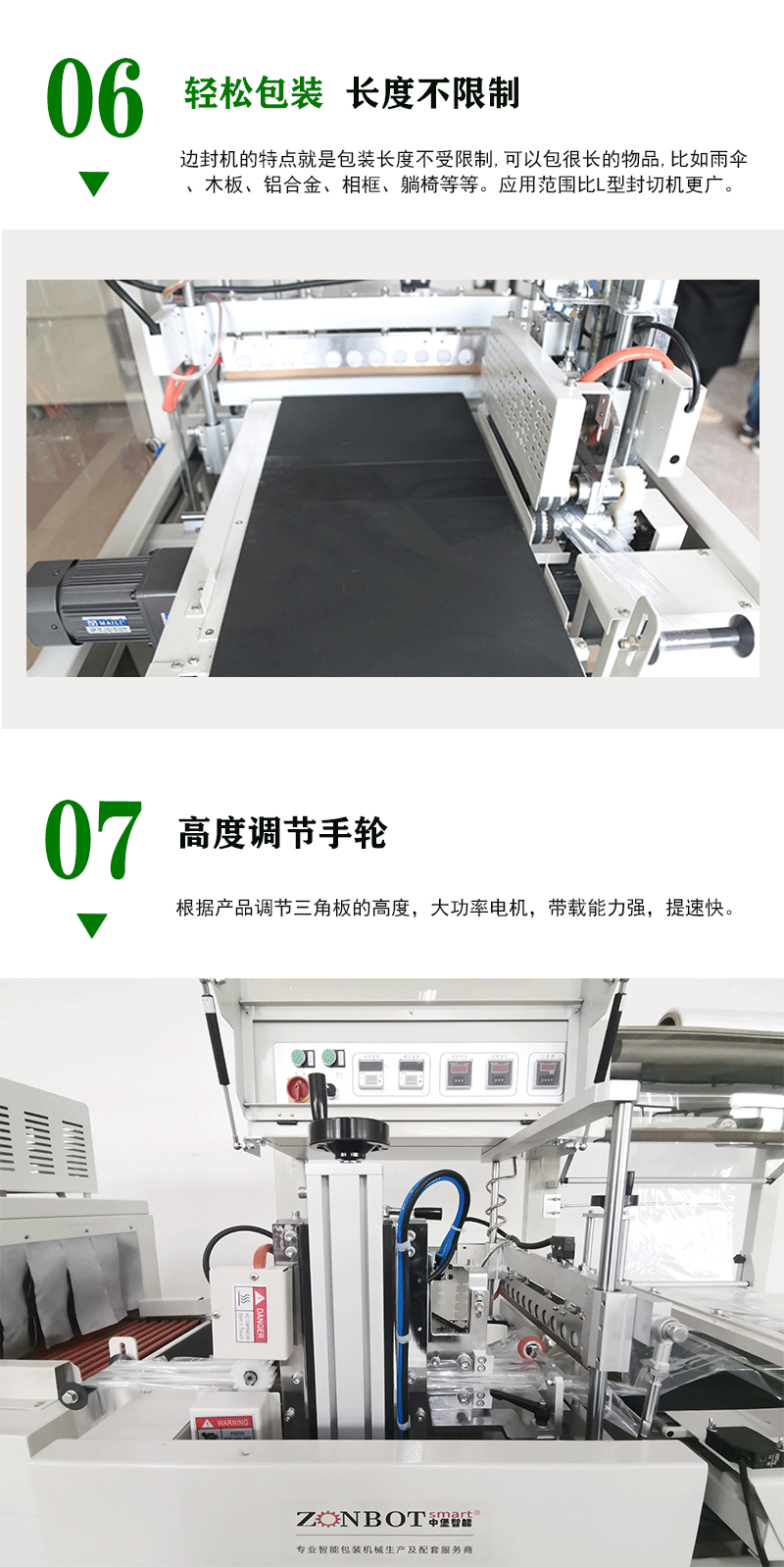 • 控制器(如 PLC):作為機器的核心控制單元,接收來自各種傳感器(如薄膜張力傳感器、產品位置傳感器等)的信號,然后根據預設的程序和操作人員設定的參數,對薄膜供給系統、產品輸送系統和邊封系統等進行精確控制,確保機器的穩定運行和包裝過程的準確性。