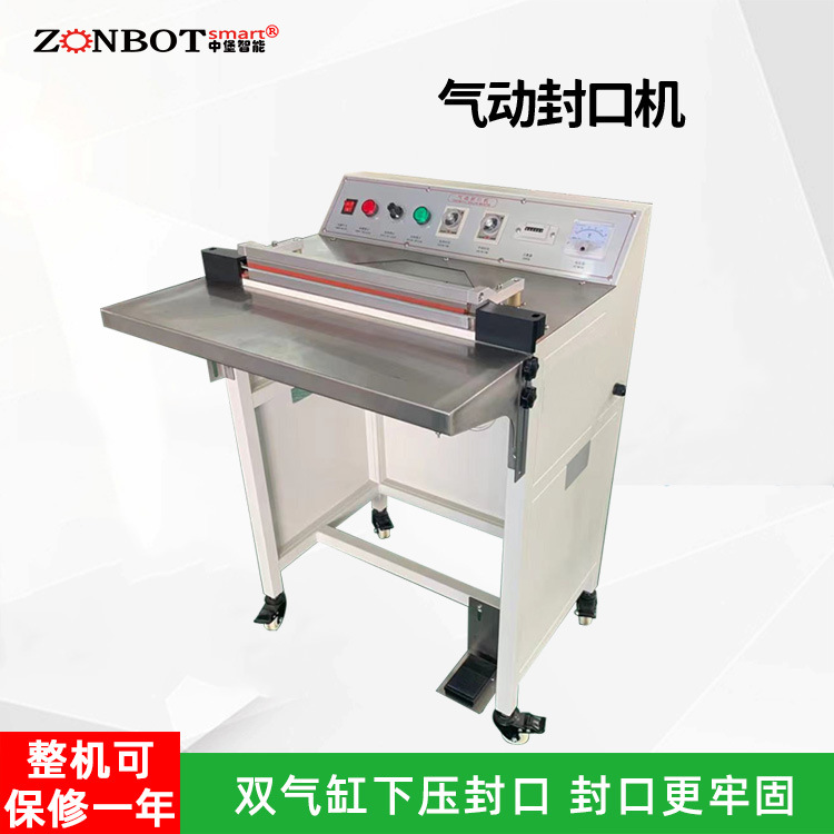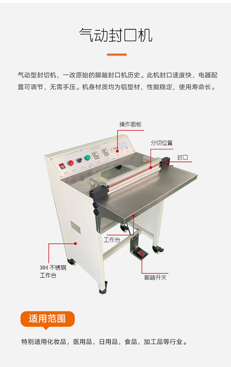 以常見的腳踏封口機為例,封口長度可達 450mm,封口寬度為 5MM,脈沖功率為 1.4KW,外形尺寸為 500×400×900mm 。