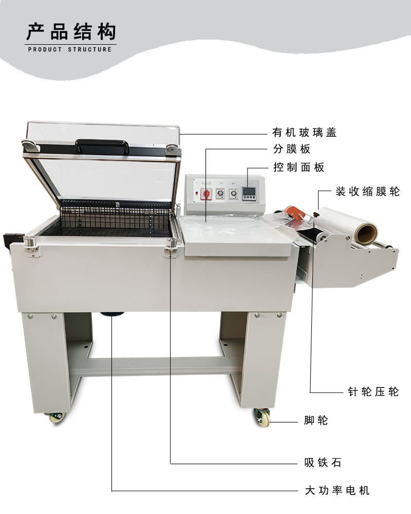 - 適用性強(qiáng):可依包裝物尺寸調(diào)整高低,適用多種規(guī)格產(chǎn)品,能使用 pvc、pof、pp 等收縮包裝材料 。