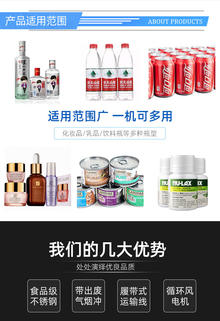 - 蒸汽收縮機:適用于對包裝溫度要求嚴格、對衛生要求較高的食品、藥品等行業,以及大桶或小瓶裝礦泉水、純凈水、汽水、茶飲料等包裝24。