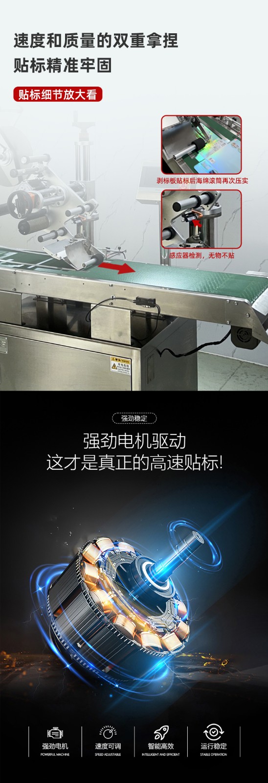 緊接著,分離后的標簽或產品快速進入貼標環節。貼標機構采用先進的傳感技術與高精度貼標頭,當產品通過輸送線到達指定貼標位置時,傳感器瞬間捕捉到信號,并即刻將指令傳達至貼標頭。貼標頭以極快的響應速度,將標簽從卷狀材料上精準剝離,隨后以恰到好處的壓力和速度,將標簽平整、牢固地貼附在產品表面。整個貼標過程一氣呵成,動作流暢且連貫,幾乎沒有絲毫停頓。