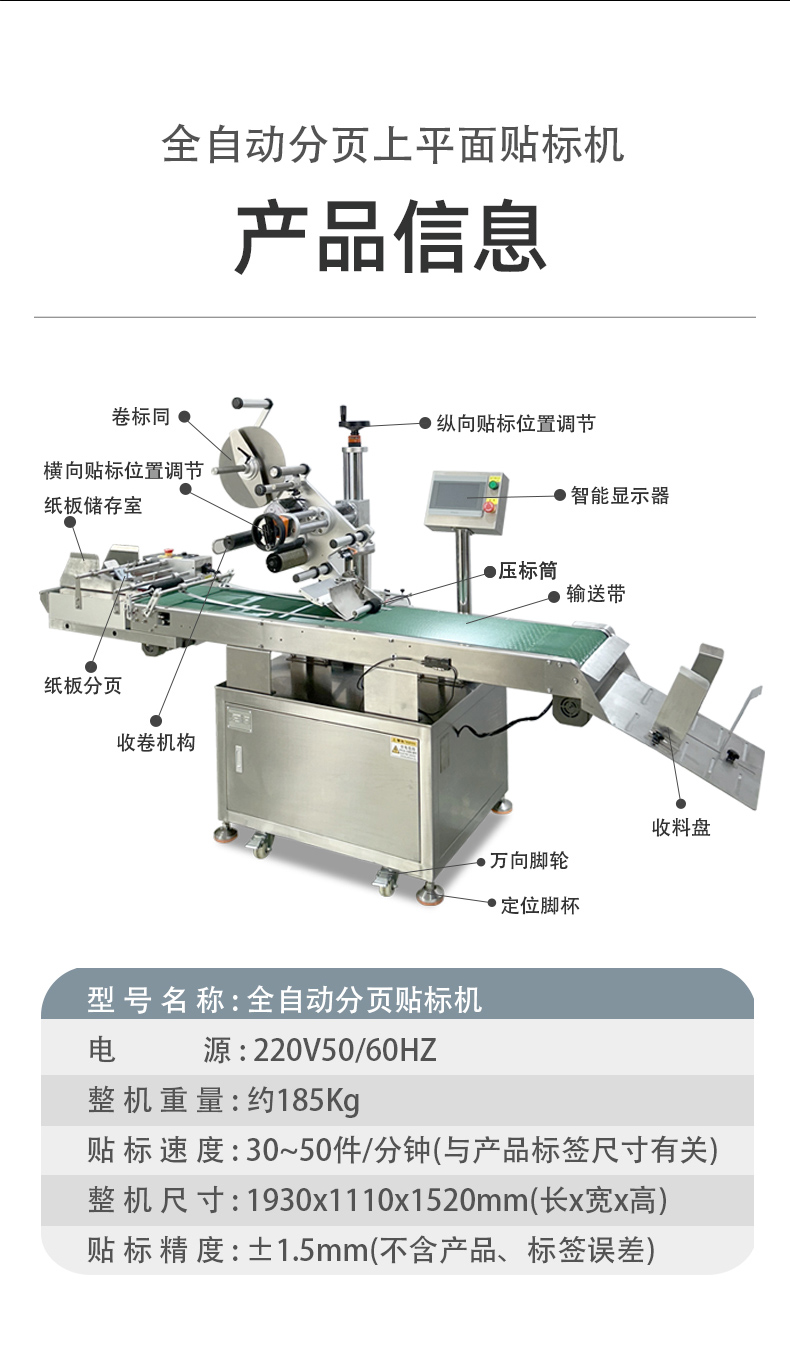 全自動分頁貼標機作為現代生產線上的高效利器,具備極為出色的連續作業能力。其內部構造精密且協同性強,分頁裝置運用獨特的機械原理,如高速旋轉的分頁滾輪,通過精準調控的摩擦力,能夠將堆疊在一起的標簽或待貼標產品迅速且穩定地逐張分離。在分離過程中,速度把控極為精準,可根據預設參數,以每分鐘高達數百甚至上千次的頻率持續運作,這一速度遠遠超越了人工手動分頁的極限。
