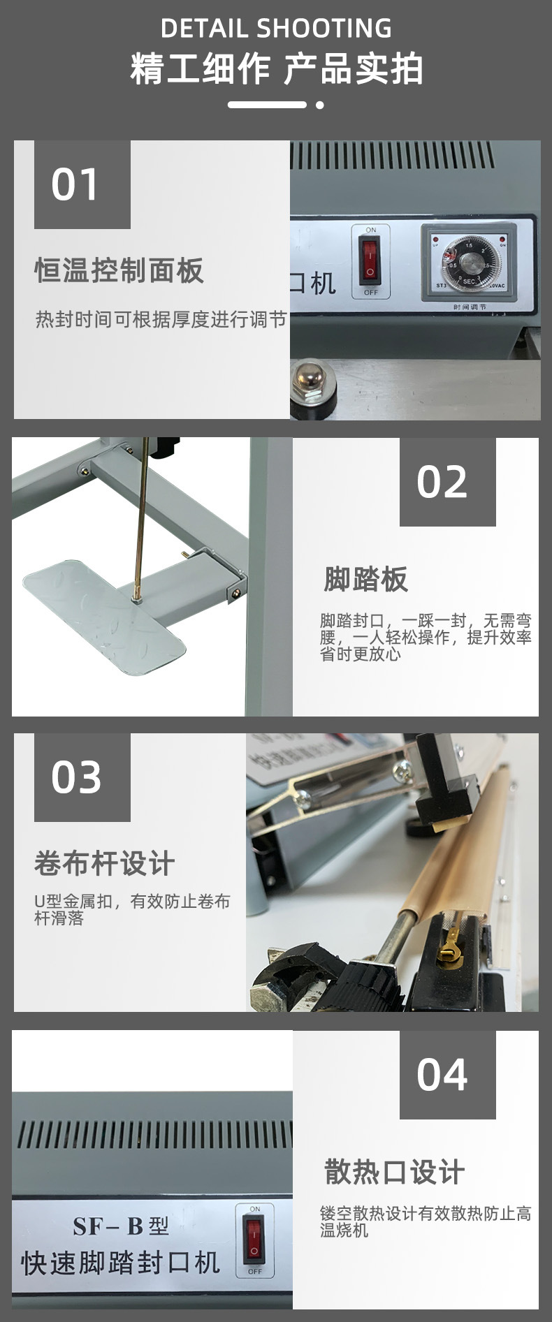 此外,?腳踏封口機還適用于各種塑料薄膜、?復合薄膜及鋁塑薄膜的封合,?廣泛應用于食品、?土特產、?糖果、?茶葉、?醫藥、?五金等行業。?這種設備的操作簡單,?加熱時間可調,?接通電源即可工作,?使得它在商店、?家庭、?工廠等環境中成為方便且經濟的封口解決方案