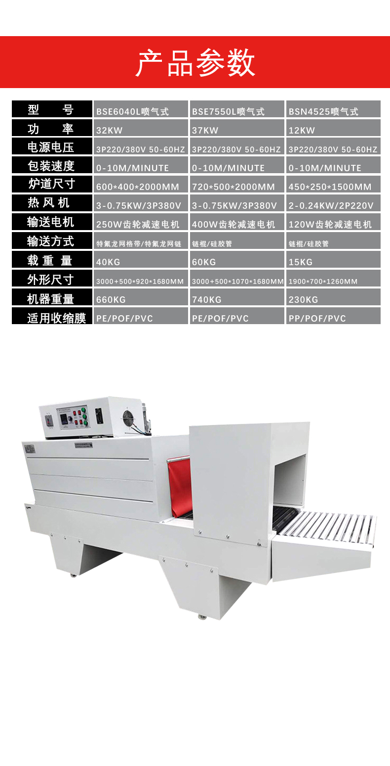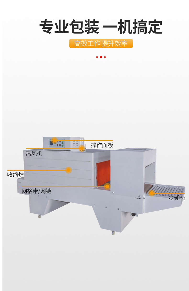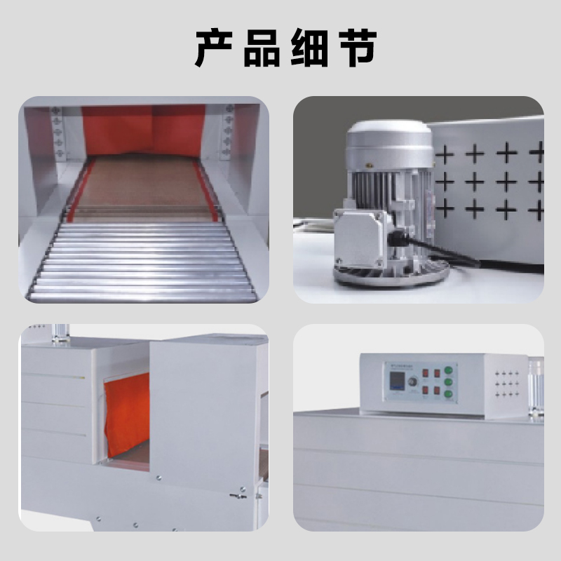 - 輸送速度:輸送速度決定了產品在加熱通道內的停留時間,從而影響薄膜的收縮效果。輸送速度一般在 0.5 - 10 米 / 分鐘之間可變。對于大型、復雜形狀或需要充分收縮的產品,通常會采用較慢的輸送速度,以保證足夠的加熱時間;而對于小型、簡單形狀的產品,可以適當提高輸送速度來提高包裝效率。