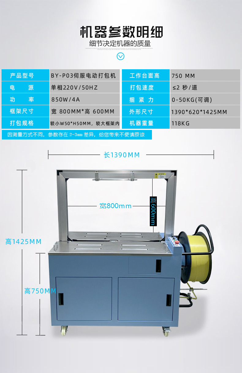 - 全自動伺服打包機通常具有簡潔、緊湊的外觀設計,整體結構堅固耐用。其機身主要由框架、工作臺、輸送帶、控制箱等部分組成。框架一般采用優質金屬材料制成,經過精細加工和表面處理,具有良好的穩定性和耐腐蝕性。工作臺位于機器的中央位置,是放置待打包物品的區域,表面平整光滑,便于物品的放置和移動。輸送帶貫穿整個機器,用于輸送物品進出打包區域,其寬度和長度根據不同的機型有所差異,以適應各種尺寸的物品打包??刂葡渫ǔ0惭b在機器的一側,集成了操作面板和控制系統,方便操作人員進行參數設置和對機器的運行進行監控。