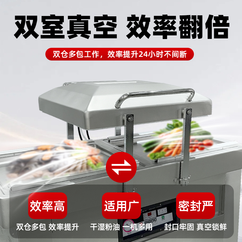 - 雙室設計:一個真空室在抽真空時,另一個真空室可以擺放包裝物,交替工作,節(jié)省操作時間,提高包裝效率。